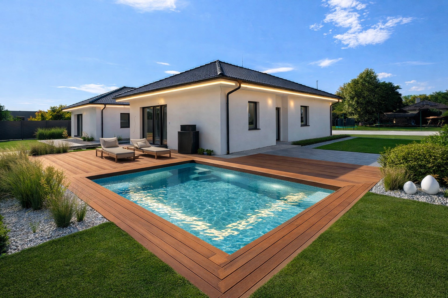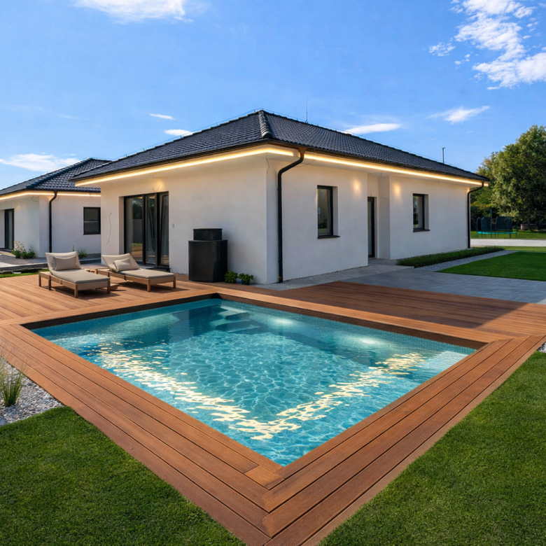 Aktuálne sú dokončené 2/4 domov a v galérii fotiek nájdete vizualizácie stavu dokončenia “na kľúč”, čo vieme zabezpečiť u našich partnerov, ale aj reálny stav domu “ŠTANDARD”. V cene je zahrnuté: dom v štádiu štandard (podlahy, podlahové kúrenie v celom dome, zárubne s dverami, kúpeľne a toalety, elektrické žalúzie s ovládačmi, príprava na kuchyňu), 3x parkovacie miesta pred domom a chodník okolo domu, terasa, voda v podobe studne (zatiaľ obec neschválila pripojenie obecného vodovodu do časti Háj), odpad v podobe žumpy, oplotenie okolo celého domu. Obec má údajne v záujme celú lokalitu časom napojiť aj na vodovod aj na kanalizáciu.